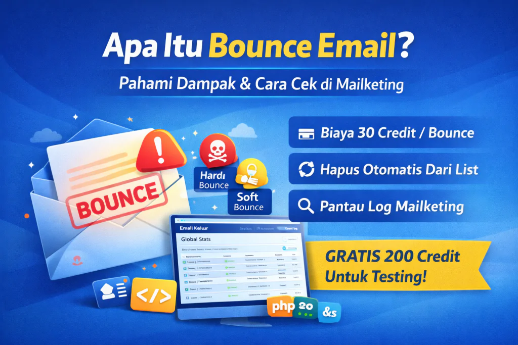 Bounce email adalah kondisi di mana email gagal terkirim karena ditolak oleh server penerima.Di Mailketing, setiap email yang terdeteksi bounce akan dikenakan biaya 30 credit, dan alamat tersebut akan otomatis dihapus dari database demi menjaga reputasi domain pengirim. Seluruh aktivitas bounce dapat dipantau secara transparan melalui menu Statistics → Global Stats. Dalam email marketing, bounce […]