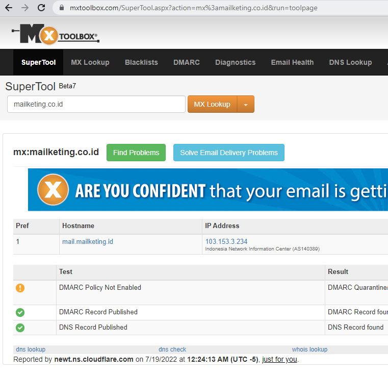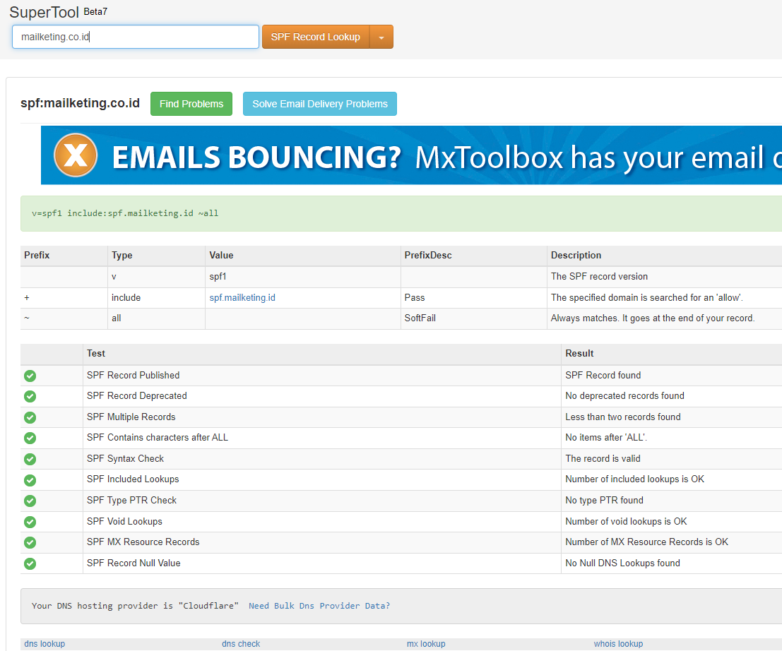 Syarat spf record yang benar, juga ditunjukkan ketika mengecek dengan mxtoolbox