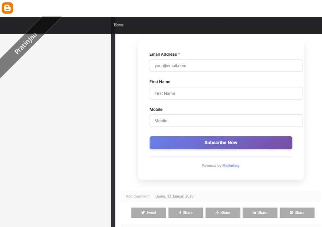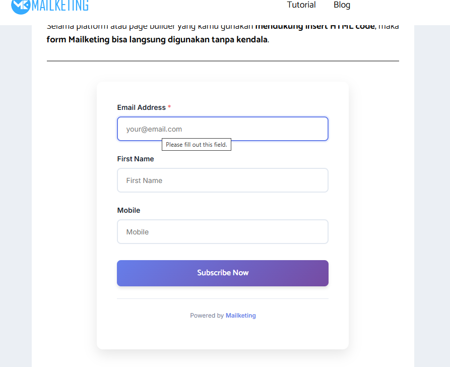 Selama platform atau page builder yang kamu gunakan mendukung insert HTML code, maka form Mailketing bisa langsung digunakan tanpa kendala.