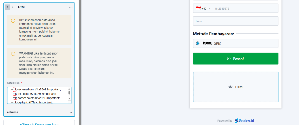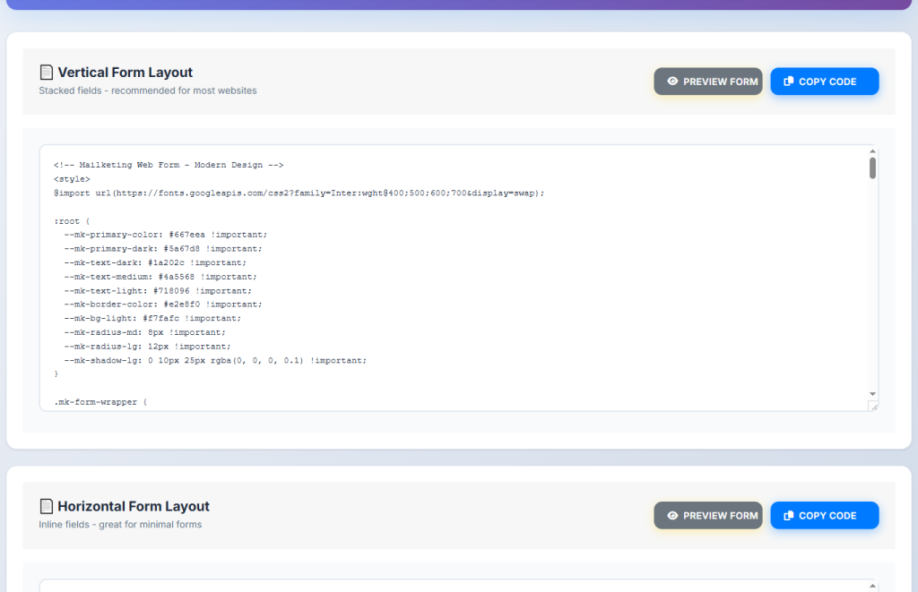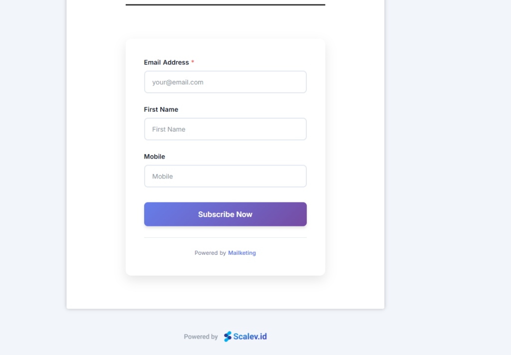 Form Mailketing menyediakan HTML code yang dapat kamu insert / embed langsung ke landing page atau website yang mendukung input HTML.