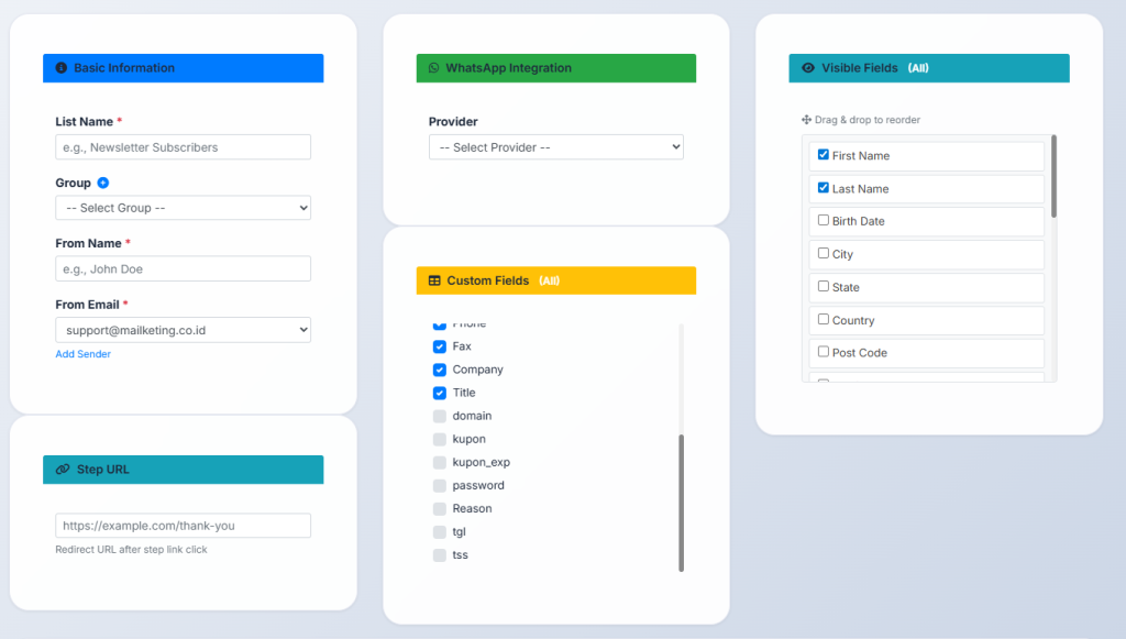 - List digunakan untuk Campaign, Autoresponder, Rules, Step Link, dan WhatsApp Integration