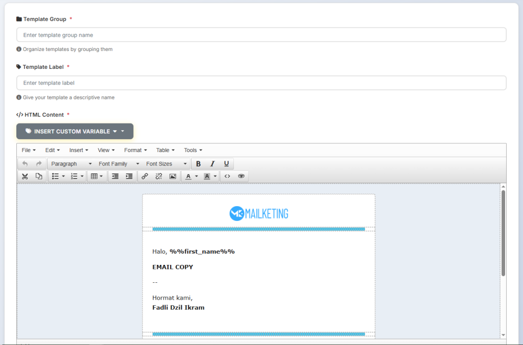 Dengan template default, kamu cukup memodifikasi body konten email, sementara struktur header dan footer sudah siap.