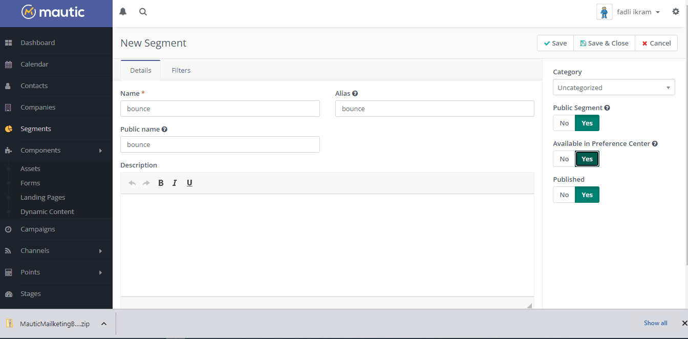 Anda dapat membuat segment pada mautic ke menu segments > new segment