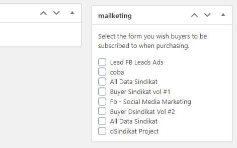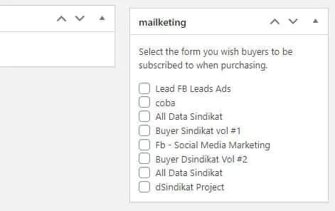 Kemudian untuk Integrasi, anda dapat ke menu download produk EDD pada wordpress anda, ketika membuat / edit produk baru akan muncul opsi mailketing seperti ini pada widget kanan