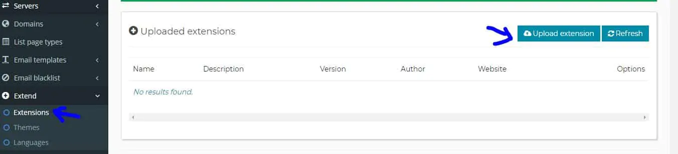 2. Kemudian Buka Mailwizz Anda, dan Silahkan Ke Menu Extention dan klik Upload Extention