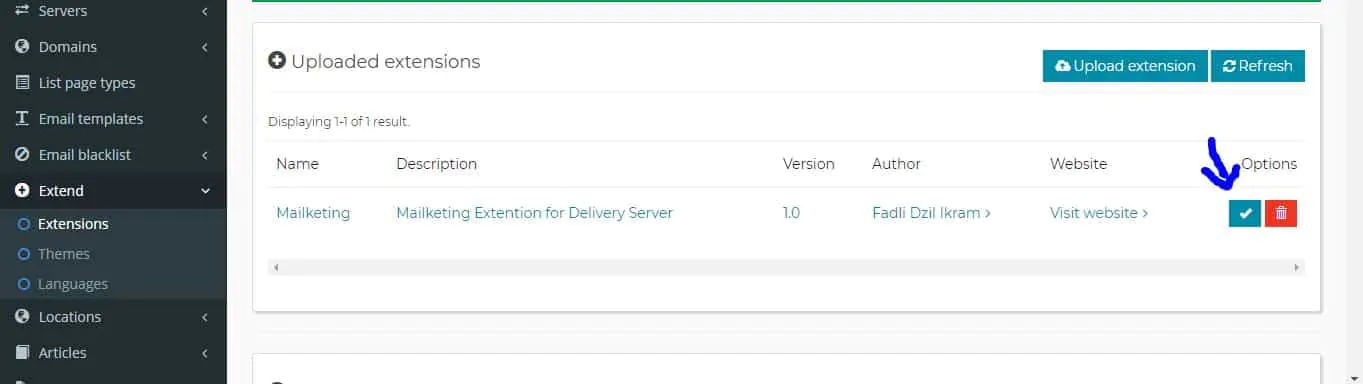 3. Upload File Mailketing-Mailwizz.zip yang sudah di download tadi,setelah selesai upload, silahkan enable extention Mailketing