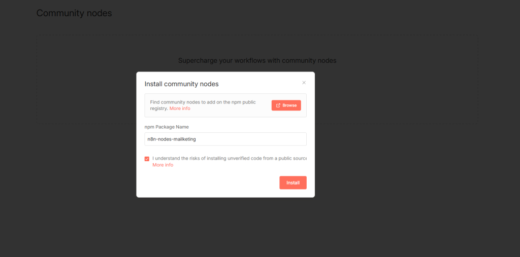2. Install Community Nodes, npm packages : n8n-nodes-mailketing