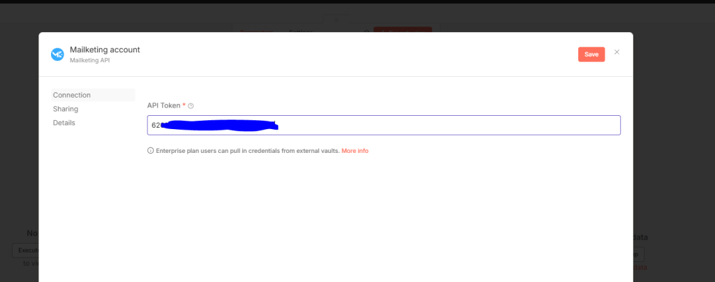 3. Ambil api token mailketing dari akun mailketing pada menu Integration > Email Aplication API > copy api token, dan input pada credential > save.