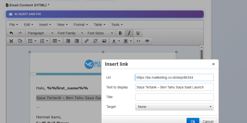- Anda menyisipkan Step Link di dalam email