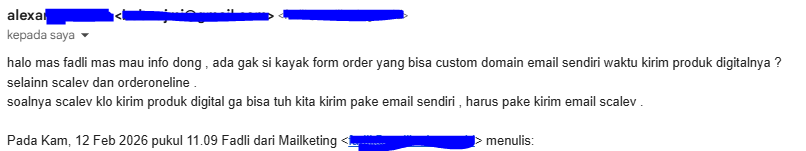 halo mas fadli mas mau info dong , ada gak si kayak form order yang bisa custom domain email sendiri waktu kirim produk digitalnya ?